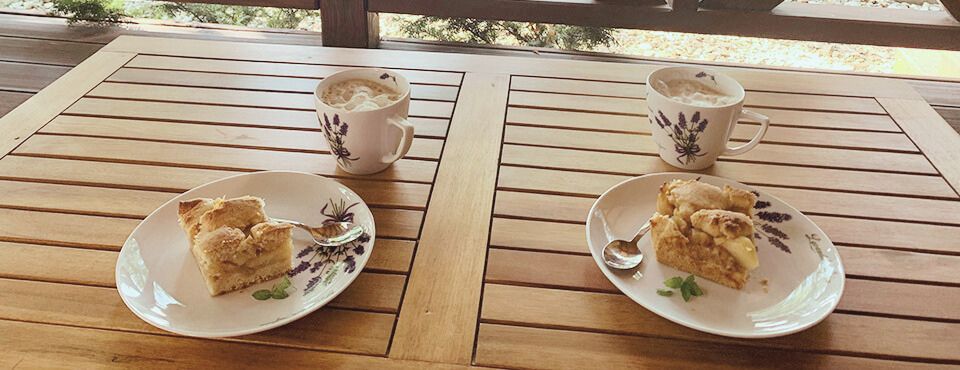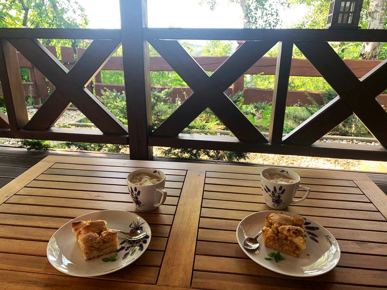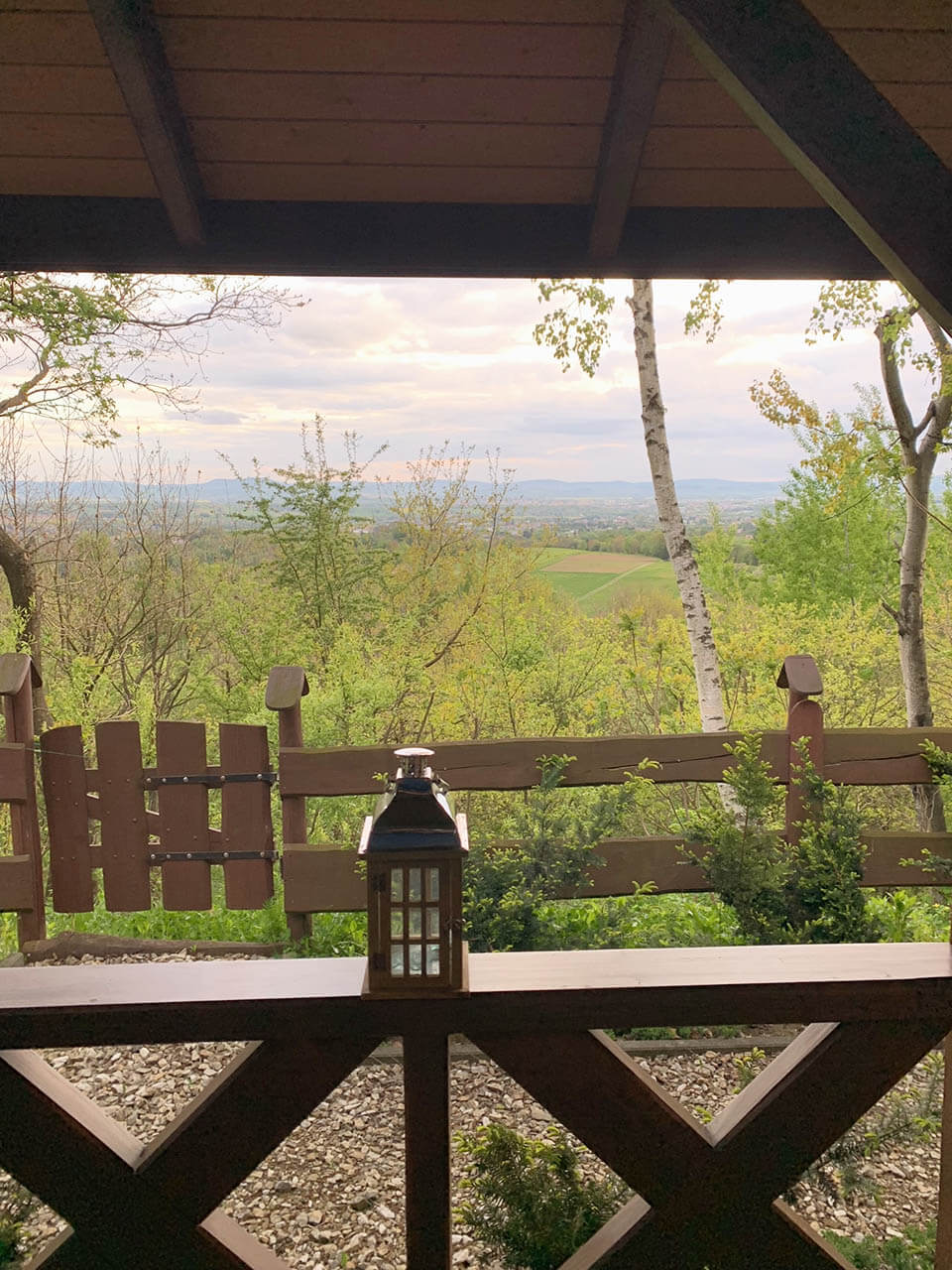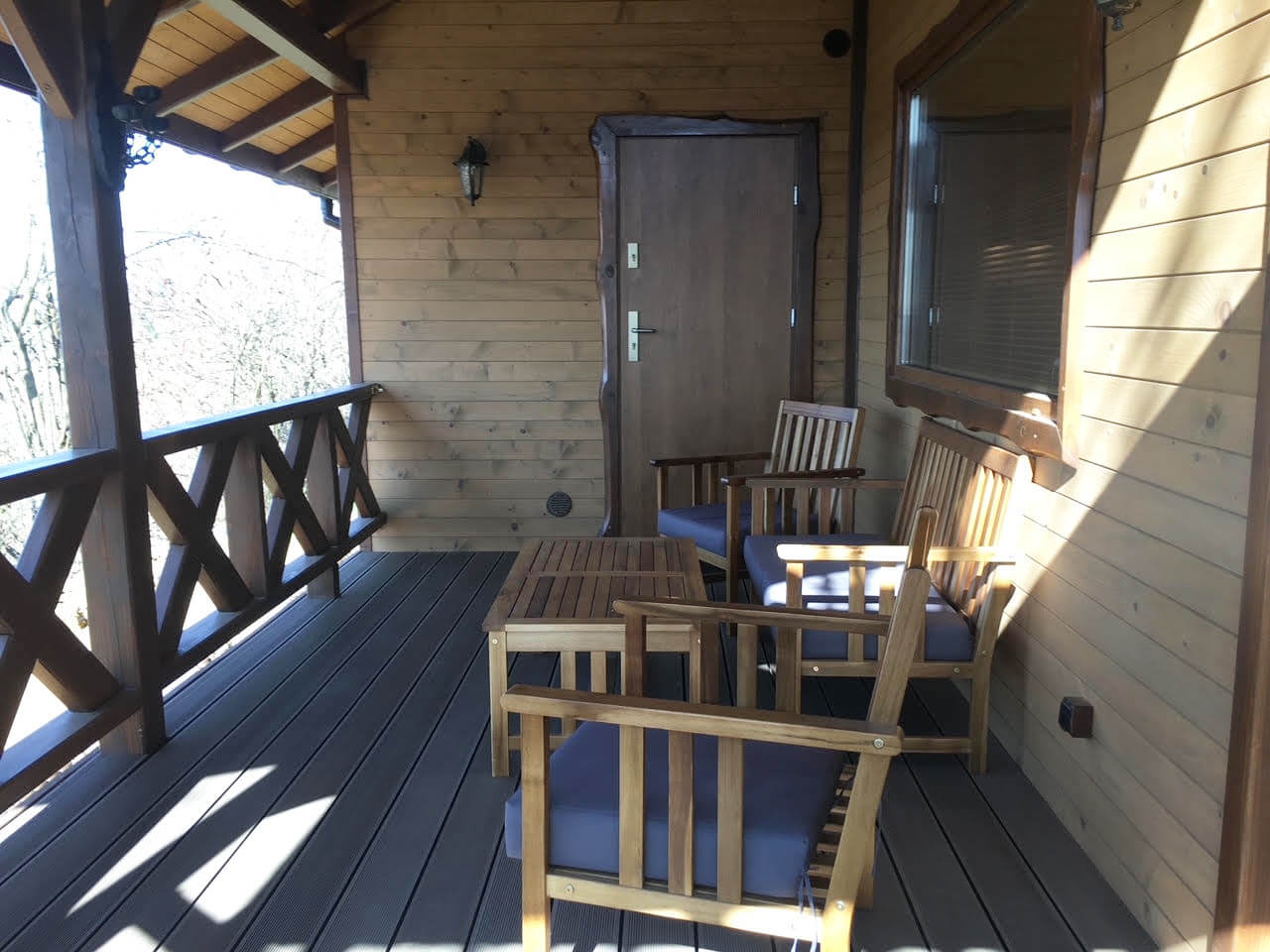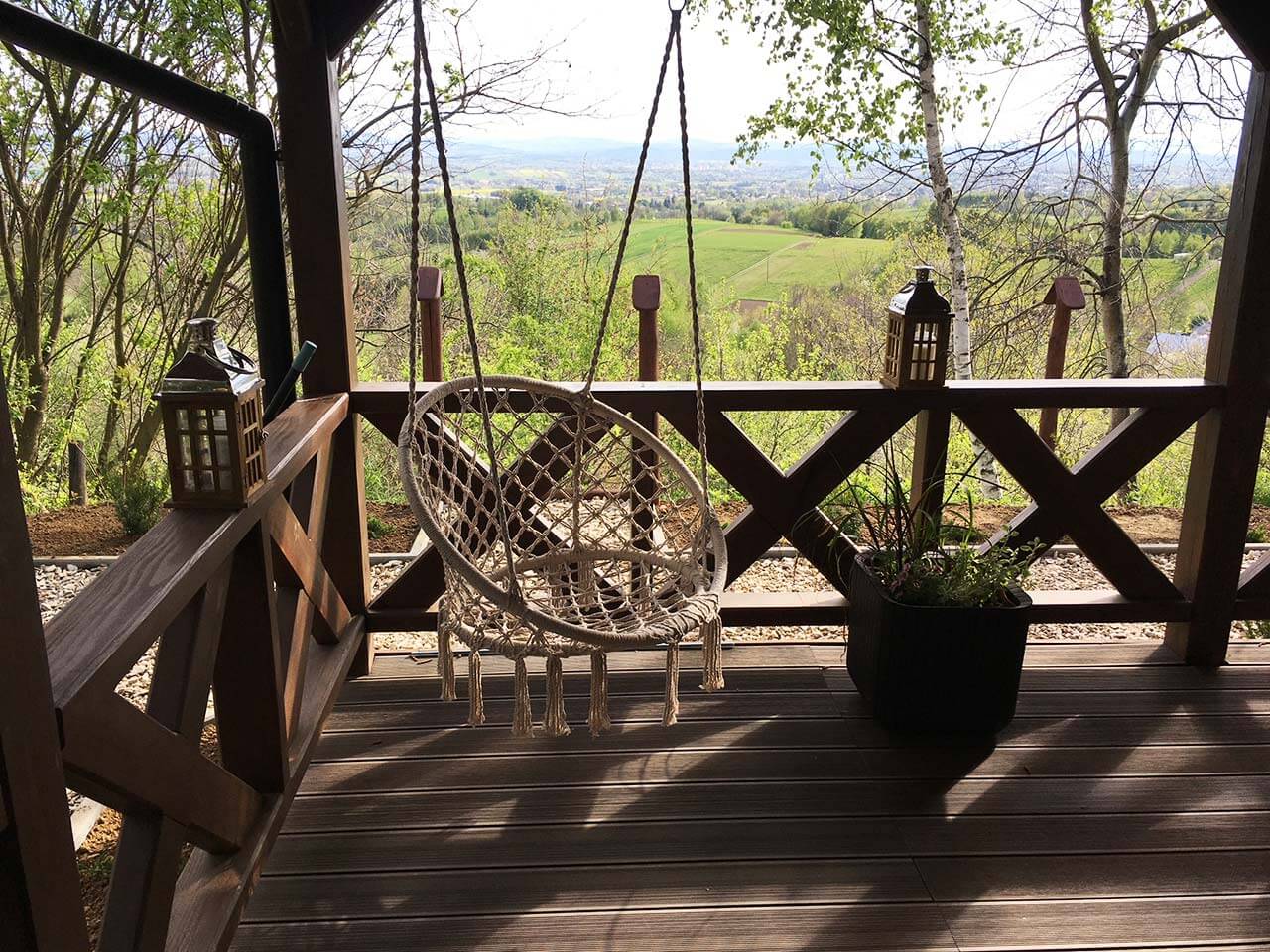 Z tarasu naszego domku roztacza się piękny widok na okoliczne tereny. To idealne miejsce na poranną kawę, czytanie książki czy podziwianie zachodów słońca.